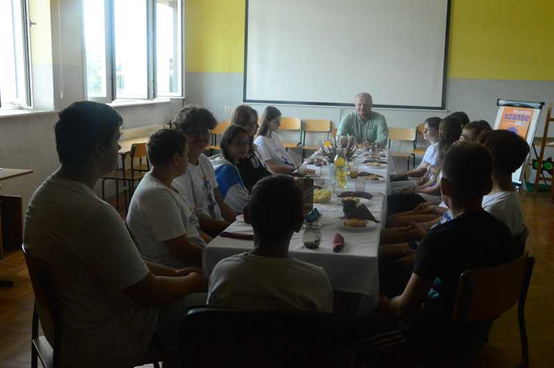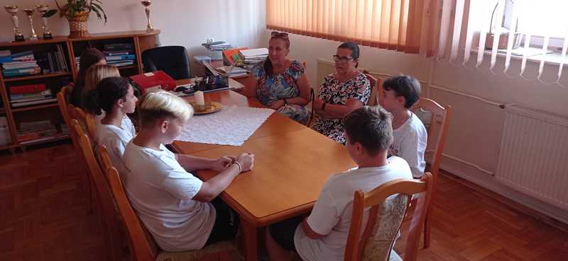 Grupa uczestników naszego projektu spotkała się 30. sierpnia z dyrektorem Zespołu Szkolno - Przedszkolnego w Ulanowie panią Anną Pucko. Powiedzieliśmy o naszych projektowych planach, o marzeniu, żeby zorganizować świetlicę dla dzieci i młodzieży z naszego środowiska oraz o tym, co chcemy w tej świetlicy organizować. Poprosiliśmy panią dyrektor o możliwość skorzystania ze szkolnych pomieszczeń, np. z sali gimnastycznej. To spotkanie było dla nas dużym przeżyciem i ważnym zadaniem.