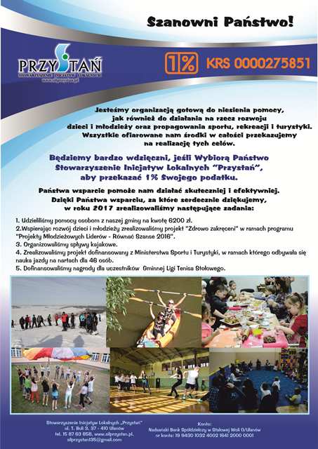 Stowarzyszenie Inicjatyw Lokalnych "Przystań" po opracowaniu diagnozy potrzeb młodzieży w środowisku lokalnym zostało zakwalifikowane do drugiego etapu Ogólnopolskiego Konkursu Grantowego "Równać Szanse 2018". Uczniowie szkoły podstawowej i gimnazjum w Ulanowie pracują nad nowym projektem. Trzeba marzenia przekuć na plan, wymyślić projekt i napisać wniosek do Polskiej Fundacji Dzieci i Młodzieży. Młodzi chcą mieć swój udział w tym zadaniu. Pracę koordynuje pani Katarzyna Domaradzka.